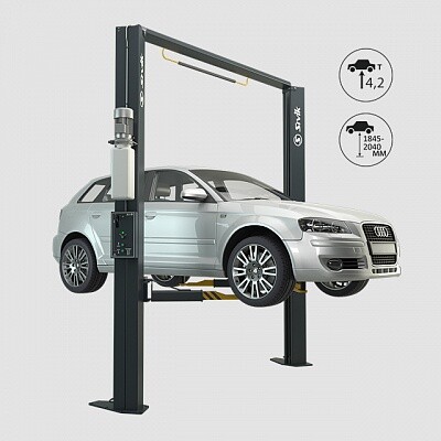 Электрогидравлический двухстоечный подъемник для легковых автомобилей и внедорожников общей массой до 3,5т. Надежная ассиметричная конструкция подъемника с верхней связью для комфортного и безопасного выполнения любых слесарных работ.